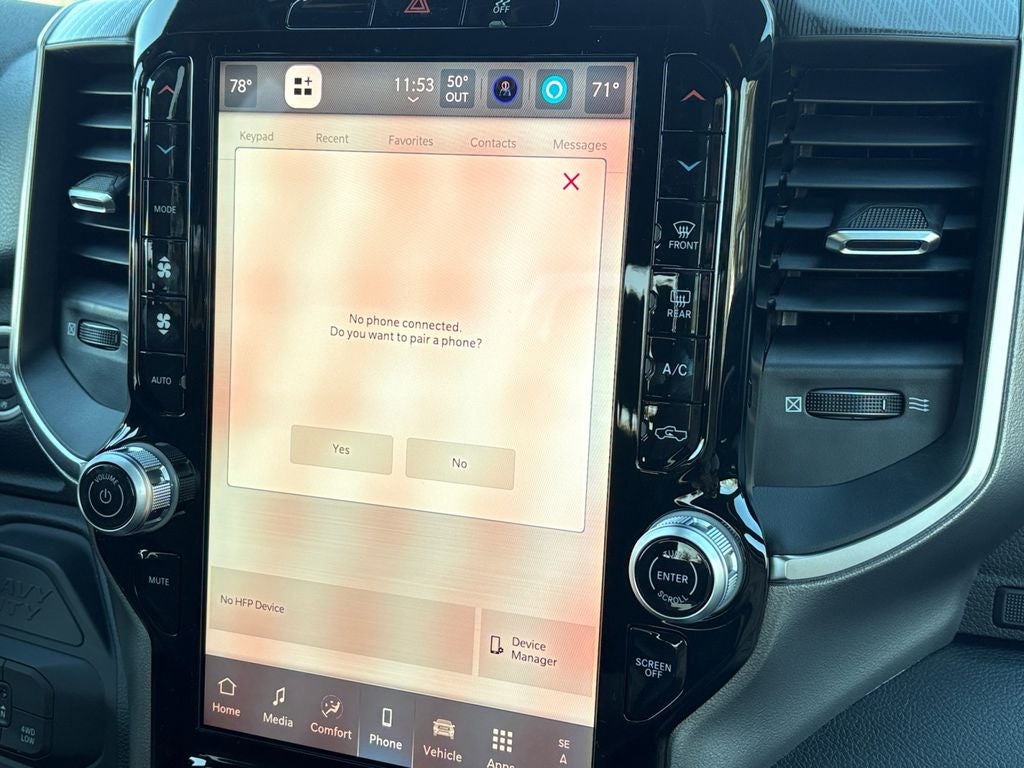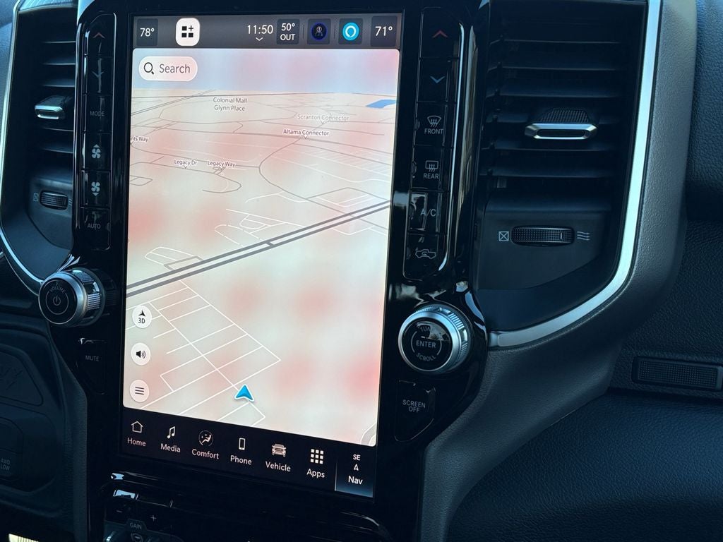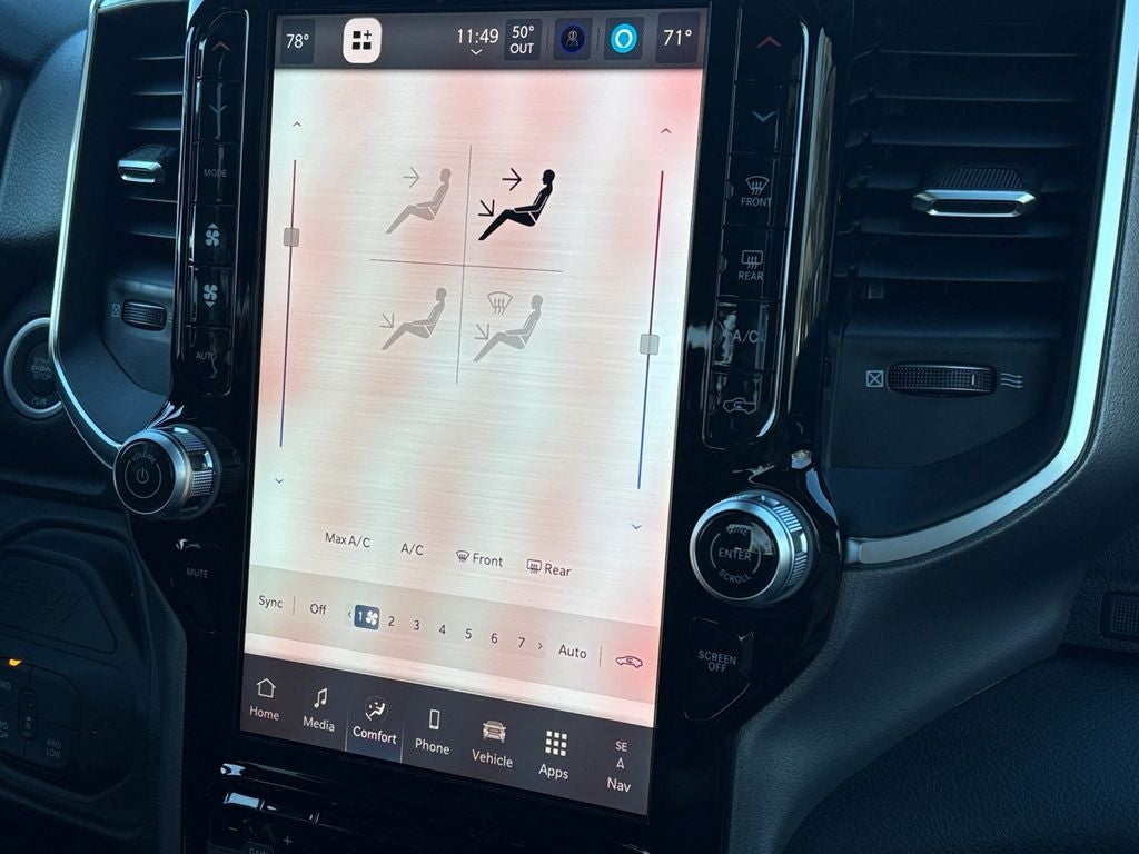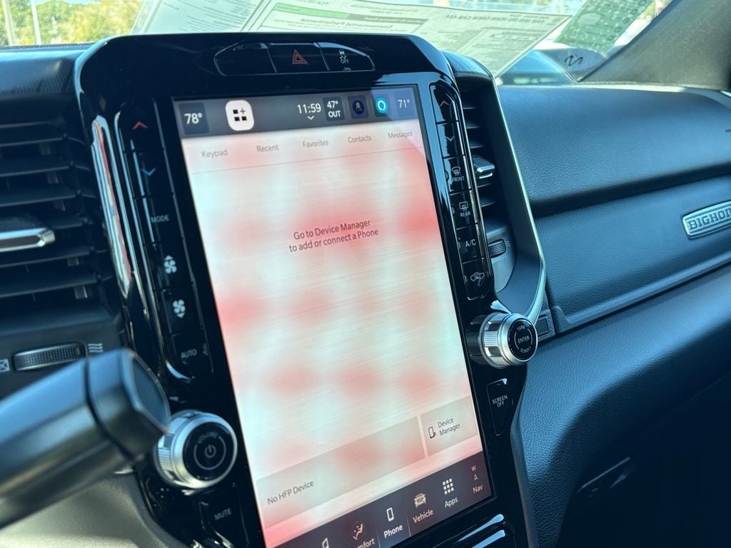 Quick Order Package 24Z Big Horn. Night Edition: Firestone Brand Tires; Gloss Black Nostrils/mic Black Grille; LT285/60R20E OWL On/off Road Tires; Black Exterior Truck Badging; 20" X 8.0" Black Painted Aluminum Wheels; Body Color Grille-Surround; Black Interior Accents; Black Wheel Center Hub; Painted Front Bumper; Painted Rear Bumper. Big Horn Level 1 Plus Equipment Group: Google Android Auto; SiriusXM Radio Service; For Details. Visit DriveUconnect.com; For More Info. Call 800-643-2112; Integrated Voice Command with Bluetooth®; Emergency Vehicle Alert System (EVAS); 12" Touchscreen Display; Glove Box Lamp; Auto Power-Folding Mirrors; Footwell Courtesy Lamp; Anti-Spin Differential Rear Axle; Mirror Running Lights; MOPAR Deployable Bed Step; Alexa Built-In; Apple CarPlay; Power-Adjustable Convex Aux Mirrors; Forward and Reverse Utility Lights; Locking Lower Glove Box; Remote Start System; 9 Alpine Speakers with Subwoofer; Disassociated Touchscreen Display; Dual Glove Boxes; 2nd Row in Floor Storage Bins; Rear View Auto Dim Mirror; Rear Dome with On/off Switch Lamp; LED Bed Lighting; Connectivity - US/Canada; GPS Navigation; 4G LTE Wi-Fi Hot Spot; GPS Antenna Input; Exterior Mirrors with Heating Element; SiriusXM with 360L; Global Telematics Box Module; Connected Travel and Traffic Services; Foam Bottle Insert (door Trim Panel); Black Exterior Mirrors; Big Horn Instrument Panel Badge; Off-Road Info Pages; Selectable Tire Fill Alert; Trailer Tow Pages; HD Radio; Uconnect 5 Navigation with 12.0" Display Radio; Power Heated Folding Telescopic Mirrors; Exterior Mirrors with Supplemental Signals; Steering Wheel Mounted Audio Controls; Exterior Mirrors Courtesy Lamps; Air Conditioning ATC with Dual Zone Control; MOPAR Spray in Bedliner; Power Adjust Mirrors; Luxury Steering Wheel; Power Telescoping Mirrors. Quick Order Package 2UZ Big Horn. 5th Wheel/gooseneck Towing Prep Group. Anti-Spin Differential Rear Axle. Premium Cloth Bucket Seats. Remote Start System. Molten Red Pearlcoat. MOPAR Front and Rear Rubber Floor Mats. Power 2-Way Driver Lumbar Adjust. **Equipment listed is based on original vehicle build and subject to change. Please confirm the accuracy of the included equipment by calling the dealer prior to purchase.**