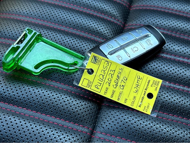 Vaden is pleased to offer this Uyuni White 2023 Genesis G70 2.0T with Obsidian Black/Red Stitch Leather... Beautifully equipped with Sport Prestige Package (4-Way Power Lumbar Front Passenger Seat, Acoustic Front Door Glass, Alloy Pedals, Dark Chrome Grille & Daylight Opening Trim, Forward & Reverse Parking Distance Warning, Front Passenger Seat Walk-In Device, Integrated Memory System (IMS), Leather Seating Surfaces, Option Group 02, Power Folding ECM Outside Mirrors, Power Telescoping Steering Wheel, Radio: AM/FM/SiriusXM/HD Lexicon Prem Audio System, Rain-Sensing Wipers, Sport Aluminum Trim, Ventilated Front Seats, Wheels: 19" x 8.0J Fr & 19" x 8.5J Rr Sport Alloy, Wide Sunroof, and Wireless Device Charging), 4-Wheel Disc Brakes, 6 Speakers, ABS brakes, Air Conditioning, Alloy wheels, AM/FM radio: SiriusXM, Android Auto & Apple CarPlay, Anti-whiplash front head restraints, Auto High-beam Headlights, Auto-dimming Rear-View mirror, Automatic temperature control, Brake assist, Bumpers: body-color, Delay-off headlights, Driver door bin, Driver vanity mirror, Dual front impact airbags, Dual front side impact airbags, Electronic Stability Control, Emergency communication system: Genesis Connected Services, Exterior Parking Camera Rear, Four wheel independent suspension, Front anti-roll bar, Front Bucket Seats, Front Center Armrest, Front dual zone A/C, Front reading lights, Fully automatic headlights, Garage door transmitter: HomeLink, Heated door mirrors, Heated front seats, Heated Multi-Adjustable Front Bucket Seats, Illuminated entry, Knee airbag, Leatherette Seating Surfaces, Low tire pressure warning, Navigation System, Occupant sensing airbag, Outside temperature display, Overhead airbag, Overhead console, Panic alarm, Passenger door bin, Passenger vanity mirror, Power door mirrors, Power driver seat, Power passenger seat, Power steering, Power windows, Radio: AM/FM/SiriusXM/HD Audio System, Rear anti-roll bar, Rear reading lights, Rear seat center armrest, Rear window defroster, Remote keyless entry, Security system, Speed control, Speed-Sensitive Wipers, Split folding rear seat, Steering wheel mounted audio controls, Tachometer, Telescoping steering wheel, Traction control, Trip computer, Turn signal indicator mirrors, Variably intermittent wipers, and Wheels: 19" x 8.0J Fr & 19" x 8.5J Rr Alloy! 4-Way Power Lumbar Front Passenger Seat, Acoustic Front Door Glass, Alloy Pedals, Dark Chrome Grille & Daylight Opening Trim, Forward & Reverse Parking Distance Warning, Front Passenger Seat Walk-In Device, Integrated Memory System (IMS), Leather Seating Surfaces, Option Group 02, Power Folding ECM Outside Mirrors, Power Telescoping Steering Wheel, Radio: AM/FM/SiriusXM/HD Lexicon Prem Audio System, Rain-Sensing Wipers, Sport Aluminum Trim, Sport Prestige Package, Ventilated Front Seats, Wheels: 19" x 8.0J Fr & 19" x 8.5J Rr Sport Alloy, Wide Sunroof, Wireless Device Charging.