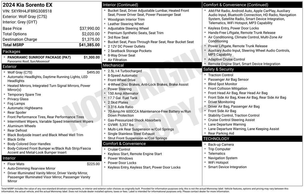 Vaden is pleased to offer 2024 Kia Sorento EX in Wolf Gray, Beautifully equipped with all the essentials and then some! Panoramic Sunroof Package (LED Interior Lighting and Panoramic Power Sunroof w/Power Sunshade), 3.316 Axle Ratio, 3rd row seats: split-bench, 4-Wheel Disc Brakes, 6 Speakers, ABS brakes, Air Conditioning, Alloy wheels, AM/FM radio: SiriusXM, Apple CarPlay & Android Auto, Auto High-beam Headlights, Auto-dimming Rear-View mirror, Automatic temperature control, Brake assist, Bumpers: body-color, Carpeted Floor Mats, Delay-off headlights, Driver door bin, Driver vanity mirror, Dual front impact airbags, Dual front side impact airbags, Electronic Stability Control, Emergency communication system: 911 Connect, Exterior Parking Camera Rear, Four wheel independent suspension, Front anti-roll bar, Front Bucket Seats, Front Center Armrest, Front dual zone A/C, Front fog lights, Front reading lights, Fully automatic headlights, Heated door mirrors, Heated Front Bucket Seats, Heated front seats, Illuminated entry, Knee airbag, Leather Shift Knob, Leather steering wheel, Low tire pressure warning, Navigation System, Occupant sensing airbag, Outside temperature display, Overhead airbag, Overhead console, Panic alarm, Passenger door bin, Passenger vanity mirror, Power door mirrors, Power driver seat, Power Liftgate, Power passenger seat, Power steering, Power windows, Radio data system, Radio: AM/FM Audio System, Rear anti-roll bar, Rear reading lights, Rear side impact airbag, Rear window defroster, Rear window wiper, Remote keyless entry, Security system, Smart Key w/ Push Button and Remote Start, Speed control, Speed-sensing steering, Split folding rear seat, Spoiler, Steering wheel mounted audio controls, SynTex Artificial Leather Seat Trim, Tachometer, Telescoping steering wheel, Tilt steering wheel, Traction control, Trip computer, Turn signal indicator mirrors, Variably intermittent wipers, and Wheels: 8.5J x 20" Gloss Black Alloy.